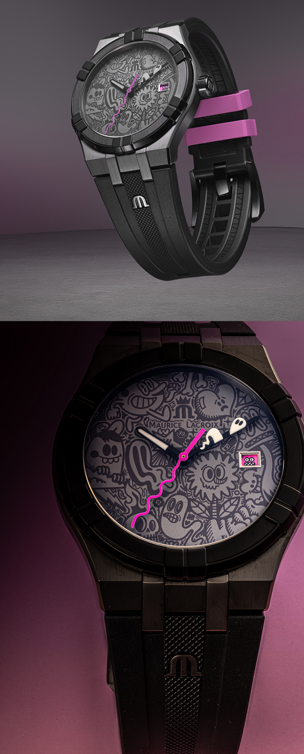 The watch took months to design and Maurice Lacroix followed my every creative direction. The packaging has a gray outside box coated in my illustration and the inside is a bright contrasting pink that showcases every character used to fill the date wheel window.
